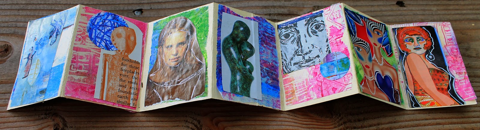 pages collaged with dictionary pages used to clean my gelli plate and brayer.  Images are packing tape transfers from old Stampington magazines.